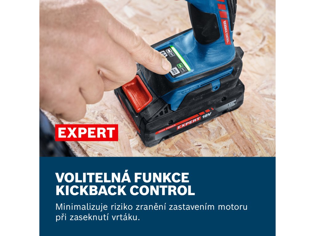 Dodává se s pokročilou ochranou uživatele: Funkce KickBack Control minimalizuje riziko zranění zastavením motoru při zaseknutí vrtáku. Tuto funkci lze vypnout a zapnout.