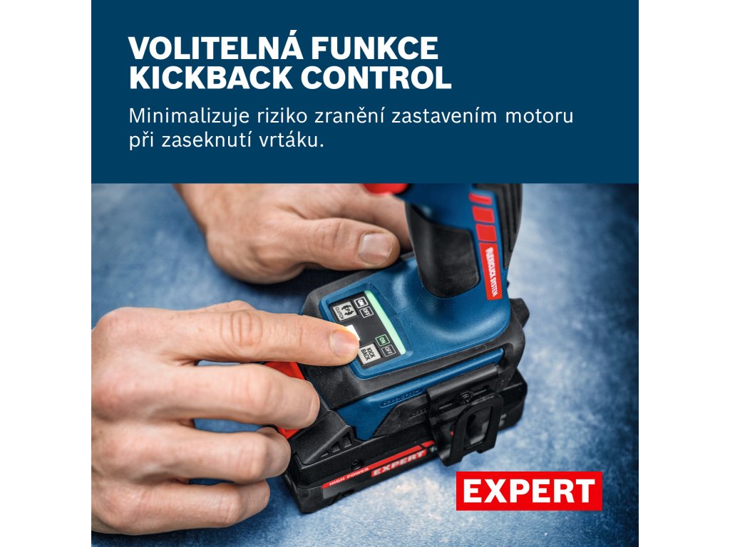 Nářadí je dodáváno s pokročilou ochranou: Funkce KickBack Control minimalizuje riziko zranění při zaseknutí bitu.