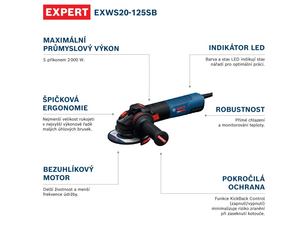EXWS20-125SB EXPERT nabízí nejlepší bezpečnost uživatele ve svém segmentu s řadou pokročilých ochranných funkcí, jako jsou KickBack Control (zastaví motor, když se nářadí zasekne), Drop Control (vypne motor při pádu nářadí), Restart Protection (vypne motor, aby se automaticky znovu nespustil po výpadku napájení), ochrana proti přetížení (chrání před přehřátím), Soft Start a Brake System.